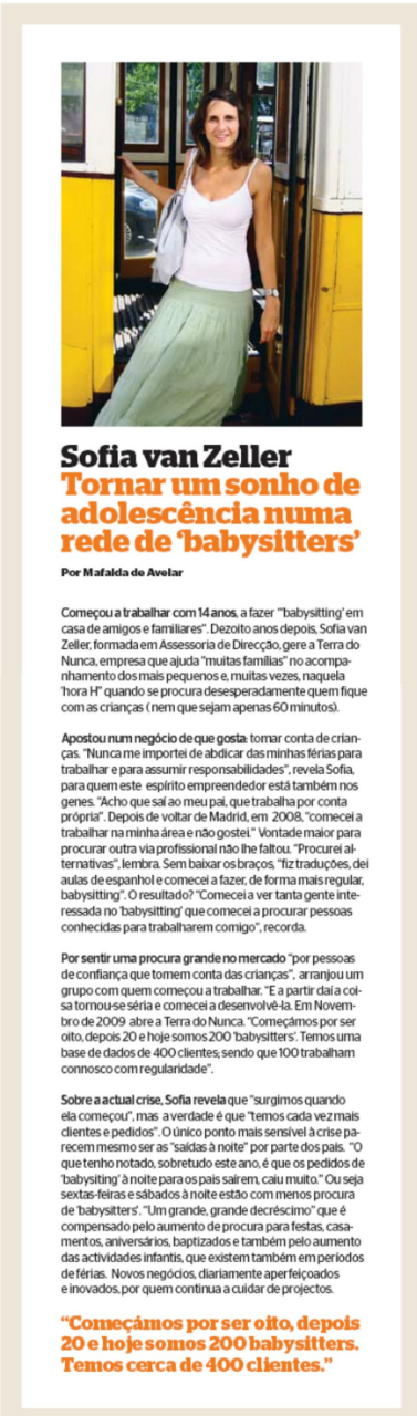 As amas a tempo inteiro são cada vez mais cobiçadas pelos pais que trabalham até tarde. "Durante muito tempo fui baby-sitter nas horas vagas", conta Sofia. Desde os 15 anos que a intérprete e tradutora de espanhol foi uma espécie de linha de emergência para os pais que queriam sair nas noites de sexta-feira.